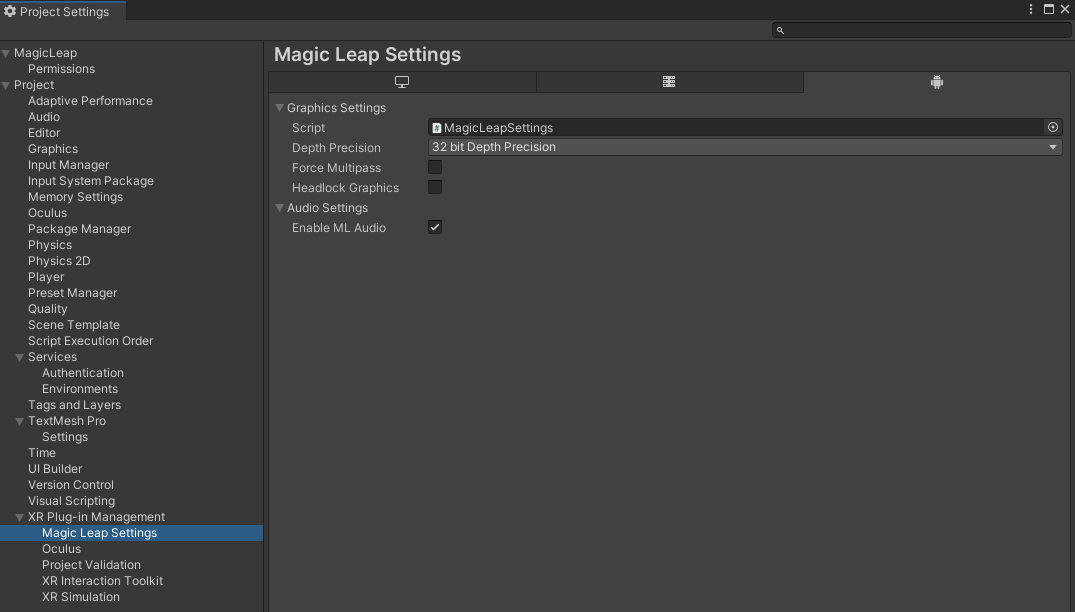 Check for more Magic Leap settings under the XR Plug-in Management section.